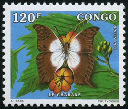Visibility: public Image owner: none postage 8/31/1991 120fr multi dt=butterflies (1991 Republic of the Congo) d=Charaxes sp. unwmk Crops No visible images cropped from this one. Measurements Resolution is unknown. Source Source name: Colnect File URL: http://i.colnect.net/b/4159/370/Charaxes-Charaxes-sp.jpg Uploaded May 3, 2018, 2:32 am by Stan Shebs |