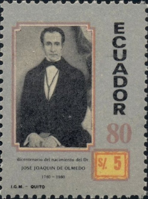 Visibility: public Image owner: none postage 4/24/1980 5s multi issue=200th Anniversary of the Birth of Jose Joaquin de Olmedo d=Jose Joaquin de Olmedo (1980) unwmk Crops No visible images cropped from this one. Measurements Resolution is unknown. Source Source name: Colnect File URL: http://i.colnect.net/b/4560/894/José-Joaquín-de-Olmedo-1780-1847-poet-and-patriot.jpg Uploaded May 9, 2018, 6:01 pm by Stan Shebs |