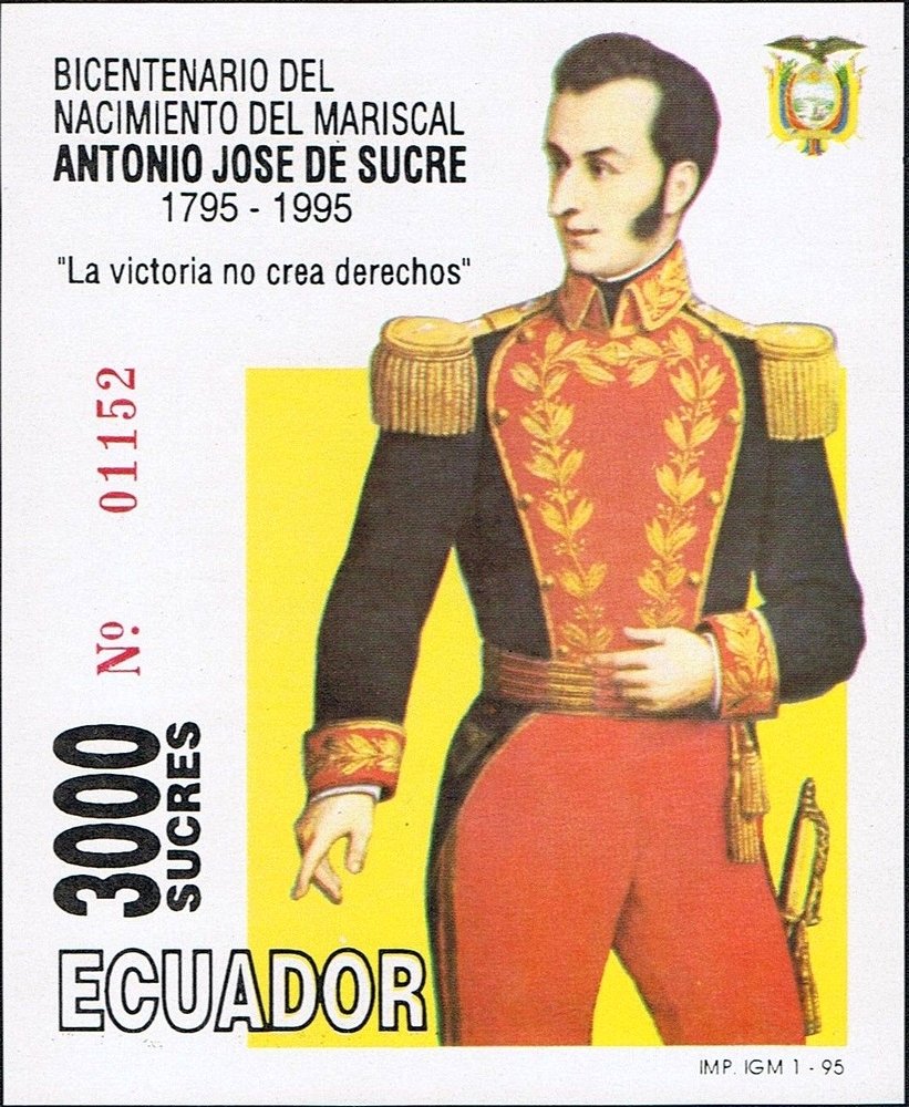 Visibility: public Image owner: none Crops No visible images cropped from this one. Measurements Resolution is unknown. Source Source name: Colnect File URL: http://i.colnect.net/b/4574/464/AJ-de-Sucre-1795-1830-general-and-politician.jpg Uploaded May 9, 2018, 6:41 pm by Stan Shebs |
