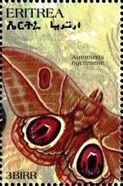 Visibility: public Image owner: none postage 6/16/1997 3b multi issue=Butterflies and Moths of the World dt=Butterflies and Moths (1997 Eritrea) d=Automeris nyctimene Crops No visible images cropped from this one. Measurements Resolution is unknown. Source Source name: Colnect File URL: http://i.colnect.net/b/4742/760/Automeris-nyctimene.jpg Uploaded May 11, 2018, 3:43 pm by Stan Shebs |