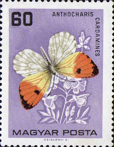 Visibility: public Image owner: none postage 2/1/1966 60f multi dt=butterflies (1966 Hungary) d=Anthocharis cardamines (1966) unwmk perf=11.5x12 Crops No visible images cropped from this one. Measurements Resolution is unknown. Source Source name: Colnect File URL: http://i.colnect.net/b/448/200/Orange-Tip-Anthocharis-cardamines.jpg Uploaded August 26, 2014, 5:48 pm by Stan Shebs |