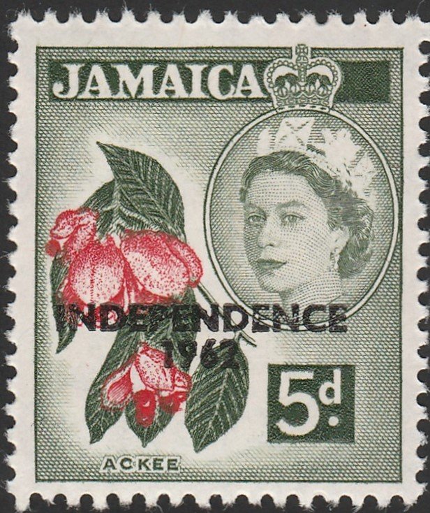 Visibility: public Image owner: none postage 8/8/1962 5p dkgrn&red issue=independence overprint d=ackee & Queen Elizabeth II ovpt=INDEPENDENCE//1962 oc=blk on=1956-5p wmk=mult crown & script CA perf=13 Crops No visible images cropped from this one. Measurements Resolution is unknown. Source Source name: Colnect File URL: http://i.colnect.net/b/4196/616/Ackee-Blighia-sapida-Sapindaceae.jpg Uploaded June 13, 2018, 2:04 am by Stan Shebs |