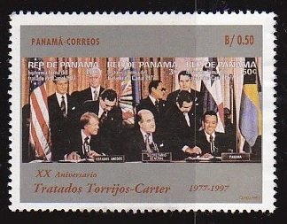 Visibility: public Image owner: none postage 9/9/1997 0.50b multi issue=20th Anniversary of Torrijos-Carter Treaty d=Kurt Waldheim (1997) unwmk Crops No visible images cropped from this one. Measurements Resolution is unknown. Source Source name: Colnect File URL: http://i.colnect.net/b/4780/650/Gen-Torrijos-and-Pres-Carter-Signing-Panama-Canal-Treaties.jpg Uploaded June 30, 2018, 5:35 am by Stan Shebs |