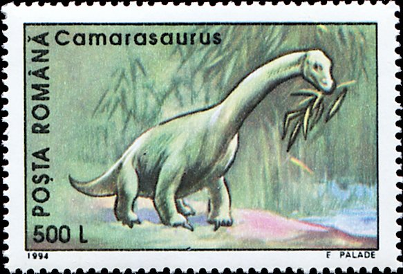 Visibility: public Image owner: none postage 4/30/1994 500l multi dt=prehistoric animals (1994 Romania) d=Camarasaurus (1994) unwmk perf=13.25 Crops No visible images cropped from this one. Measurements Resolution is unknown. Source Source name: Colnect File URL: http://i.colnect.net/b/4930/674/Camarasaurus.jpg Uploaded July 3, 2018, 6:13 pm by Stan Shebs |