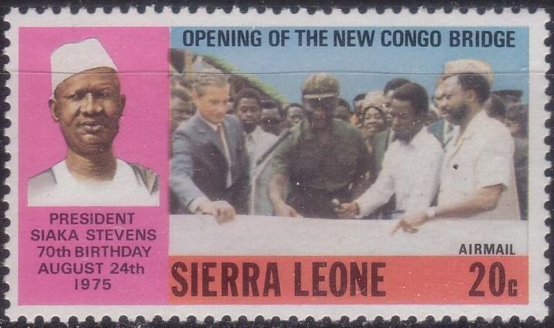 Visibility: public Image owner: none postage 8/25/1975 20c multi issue=and New Congo Bridge Opening d=Pres Siaka Stevens & Opening of Congo Bridge unwmk perf=13x13.5 Crops No visible images cropped from this one. Measurements Resolution is unknown. Source Source name: Colnect File URL: http://i.colnect.net/b/5065/774/Pres-Siaka-Stevens-and-Opening-of-Congo-Bridge.jpg Uploaded July 10, 2018, 2:31 pm by Stan Shebs |