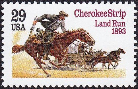 Visibility: public Image owner: none postage 4/17/1993 29c multi issue=Cherokee Strip Land Run 100th d=racing horseman & covered wagon unwmk perf=11 Crops No visible images cropped from this one. Measurements Resolution is unknown. Source Source name: Colnect File URL: http://i.colnect.net/b/5088/423/Cherokee-Strip-Land-Run-1893.jpg Uploaded July 23, 2018, 6:59 pm by Stan Shebs |