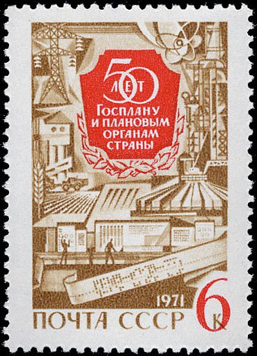 Visibility: public Image owner: none postage 2/16/1971 6k multi issue=State Planning Organization 50th unwmk perf=12 Crops No visible images cropped from this one. Measurements Resolution is unknown. Source Source name: Colnect File URL: http://i.colnect.net/b/4142/960/50th-Anniversary-of-Soviet-State-Planning-Organization.jpg Uploaded July 25, 2018, 9:27 pm by Stan Shebs |