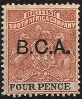Visibility: public Image owner: none postage 4/1891 4p redbrn&blk issue=1891 d=arms of BSAC (1890 a) ovpt=B.C.A. oc=blk on=issuer=Rhodesia (British South Africa Company)-issue=1890-4p Crops No visible images cropped from this one. Measurements Resolution is unknown. Source Source name: Colnect File URL: http://i.colnect.net/b/4980/248/Arms-of-British-South-Africa-Company---overprinted-BCA.jpg Uploaded August 2, 2018, 3:51 pm by Stan Shebs |