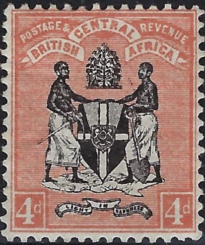 Visibility: public Image owner: none postage 2/1896 4p orgbrn&blk issue=1896 d=arms of British Central Africa (1895) wmk=crown & CA perf=14 Crops No visible images cropped from this one. Measurements Resolution is unknown. Source Source name: Colnect File URL: http://i.colnect.net/b/4980/258/Coat-of-Arms-of-BCA-coloured-background.jpg Uploaded August 2, 2018, 3:53 pm by Stan Shebs |