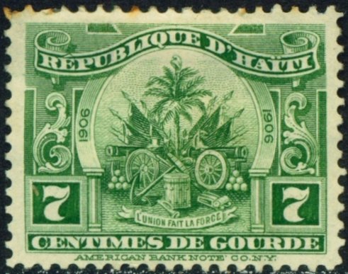 Visibility: public Image owner: none postage 7/28/1906 7cg grn issue=1906b dt=landmarks2 d=arms of Haiti unwmk Crops No visible images cropped from this one. Measurements Resolution is unknown. Source Source name: Colnect File URL: http://i.colnect.net/b/4776/682/Coat-of-Arms.jpg Uploaded August 23, 2018, 6:02 am by Stan Shebs |