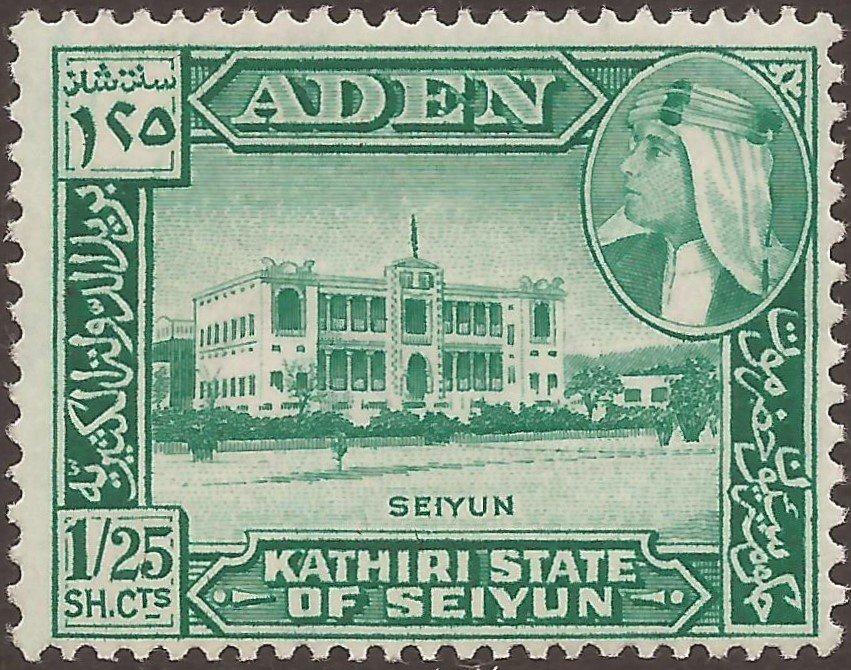 Visibility: public Image owner: none Kathiri State of Seiyun postage 7/1/1964 1sh25c grn issue=1964 d=Seiyun wmk=St Edwards crown & CA perf=13x12 Crops No visible images cropped from this one. Measurements Resolution is unknown. Source Source name: Colnect File URL: http://i.colnect.net/b/4579/259/Seiyun.jpg Uploaded September 5, 2018, 4:03 pm by Stan Shebs |