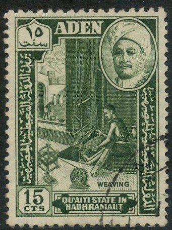 Visibility: public Image owner: none Quaiti State in Hadhramaut postage 9/1/1955 15c grn issue=1955 d=weaving wmk=mult crown & script CA perf=11.5x13 Crops No visible images cropped from this one. Measurements Resolution is unknown. Source Source name: Colnect File URL: http://i.colnect.net/b/4485/243/Weaver.jpg Uploaded September 5, 2018, 4:16 pm by Stan Shebs |