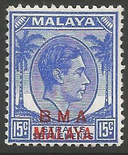 Visibility: public Image owner: none postage 1945 15c ultra issue=1945 BMA d=King George VI & palms ovpt=BMA//MALAYA oc=red on=issue=1937-15c-ultra wmk=mult crown & script CA perf=14 Crops No visible images cropped from this one. Measurements Resolution is unknown. Source Source name: Colnect File URL: http://i.colnect.net/b/5044/682/Overprinted--BMA-Malaya-.jpg Uploaded September 5, 2018, 10:44 pm by Stan Shebs |