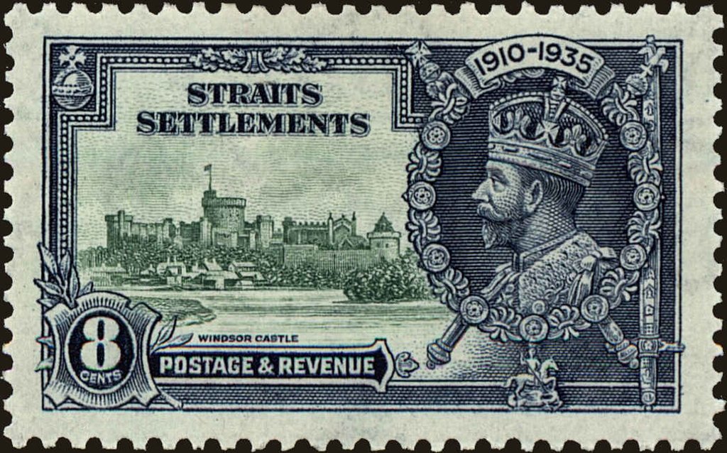Visibility: public Image owner: none postage 5/6/1935 8c dkbl&grn issue=Silver Jubilee d=Windsor Castle & King George V wmk=mult crown & script CA perf=11x12 Crops No visible images cropped from this one. Measurements Resolution is unknown. Source Source name: Colnect File URL: http://i.colnect.net/b/4581/679/Straits-Settlements.jpg Uploaded September 6, 2018, 1:31 am by Stan Shebs |