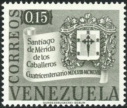 Visibility: public Image owner: none postage 10/9/1958 15c grngray issue=Santiago de Merida 400th d=seal of Santiago de Merida unwmk perf=13.5 Crops No visible images cropped from this one. Measurements Resolution is unknown. Source Source name: Colnect File URL: http://i.colnect.net/b/5073/745/Four-hundred-years-after-the-foundation-of-Santiago-de-Mérid.jpg Uploaded January 3, 2019, 3:49 am by Stan Shebs |