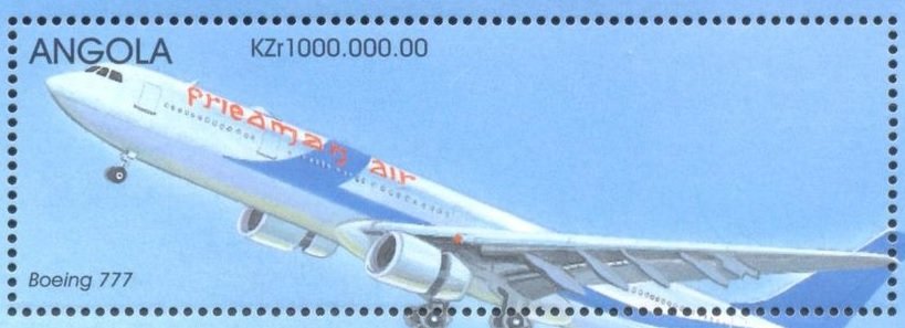 Visibility: public Image owner: none postage 12/24/1998 1000000kzr multi issue=Aircraft 1998 d=Boeing 777 unwmk Crops No visible images cropped from this one. Measurements Resolution is unknown. Source Source name: Colnect File URL: http://i.colnect.net/b/5241/308/Boeing-777-200.jpg Uploaded January 9, 2019, 4:05 pm by Stan Shebs |