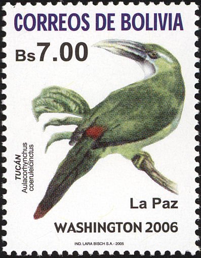 Visibility: public Image owner: none postage 6/28/2005 7.00b multi issue=Interexpo '05 dt=birds of La Paz region d=Aulacorhynchus coeruleicinctus unwmk Crops No visible images cropped from this one. Measurements Resolution is unknown. Source Source name: Colnect File URL: http://i.colnect.net/b/5174/661/Blue-banded-Toucanet-Aulacorhynchus-coeruleicinctis.jpg Uploaded January 18, 2019, 8:08 pm by Stan Shebs |
