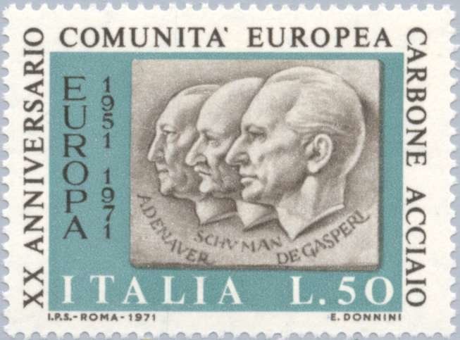 Visibility: public Image owner: none postage 4/28/1971 50l multi issue=Twenty years of the European Coal and Steel Community d=Profiles of Adenaner Schuman & De Gasperi wmk=stars Crops No visible images cropped from this one. Measurements Resolution is unknown. Source Source name: Colnect File URL: http://i.colnect.net/b/172/299/European-Coal-and-Steel-Community.jpg Uploaded January 27, 2013, 5:11 am by Stan Shebs |