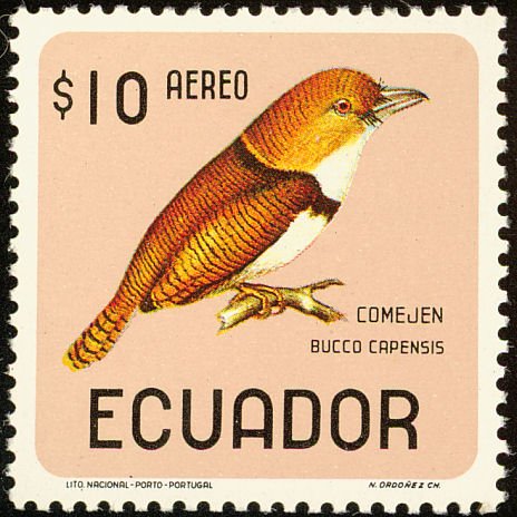 Visibility: public Image owner: none airmail 6/17/1966 10s multi dt=birds (1966 Ecuador) d=Bucco capensis (1966) unwmk Crops No visible images cropped from this one. Measurements Resolution is unknown. Source Source name: Colnect File URL: http://i.colnect.net/b/4967/624/Collared-Puffbird-Bucco-capensis.jpg Uploaded February 2, 2019, 7:12 pm by Stan Shebs |
