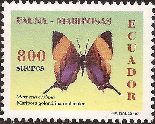 Visibility: public Image owner: none postage 7/21/1997 800s multi dt=butterflies (1997 Ecuador) d=Marpesia corinna unwmk Crops No visible images cropped from this one. Measurements Resolution is unknown. Source Source name: Colnect File URL: http://i.colnect.net/b/4967/598/Corinna-Daggerwing-Marpesia-corina.jpg Uploaded February 2, 2019, 7:51 pm by Stan Shebs |