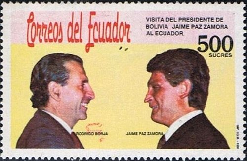 Visibility: public Image owner: none postage 12/10/1991 500s multi issue=Visit of President Jaime Paz Zamora of Bolivia unwmk Crops No visible images cropped from this one. Measurements Resolution is unknown. Source Source name: Colnect File URL: http://i.colnect.net/b/4576/532/Rodrigo-Borja-Cevallos-President-of-Ecuador--J-Paz-Zamora.jpg Uploaded February 2, 2019, 9:13 pm by Stan Shebs |