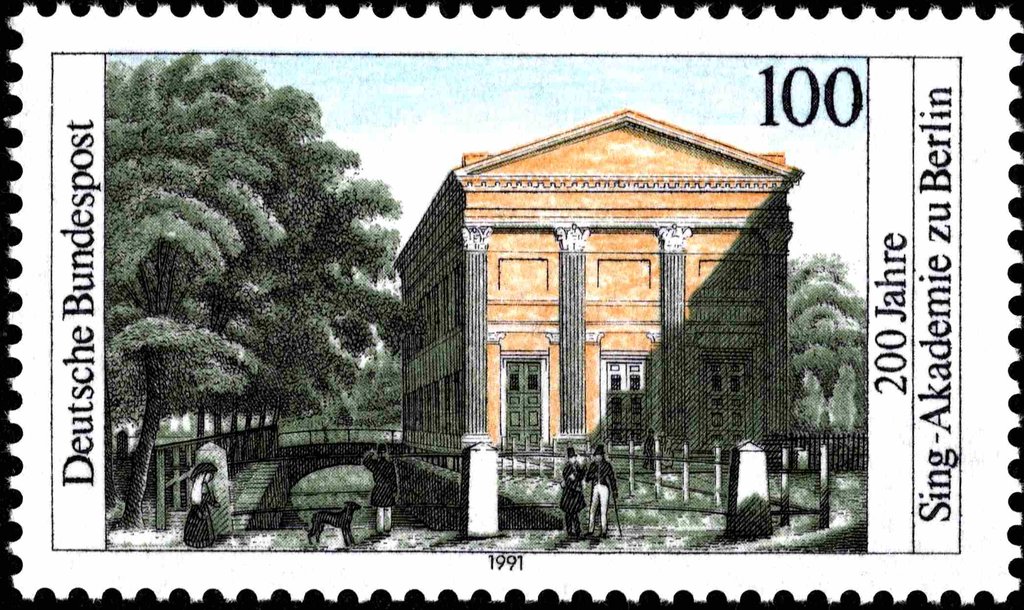 Visibility: public Image owner: none postage 4/9/1991 100(pf) multi issue=Choral Singing Academy 200th d=academy building unwmk perf=14 Crops No visible images cropped from this one. Measurements Resolution is unknown. Source Source name: Colnect File URL: http://i.colnect.net/b/5382/432/Choral-Academy-Berlin.jpg Uploaded February 8, 2019, 4:36 pm by Stan Shebs |