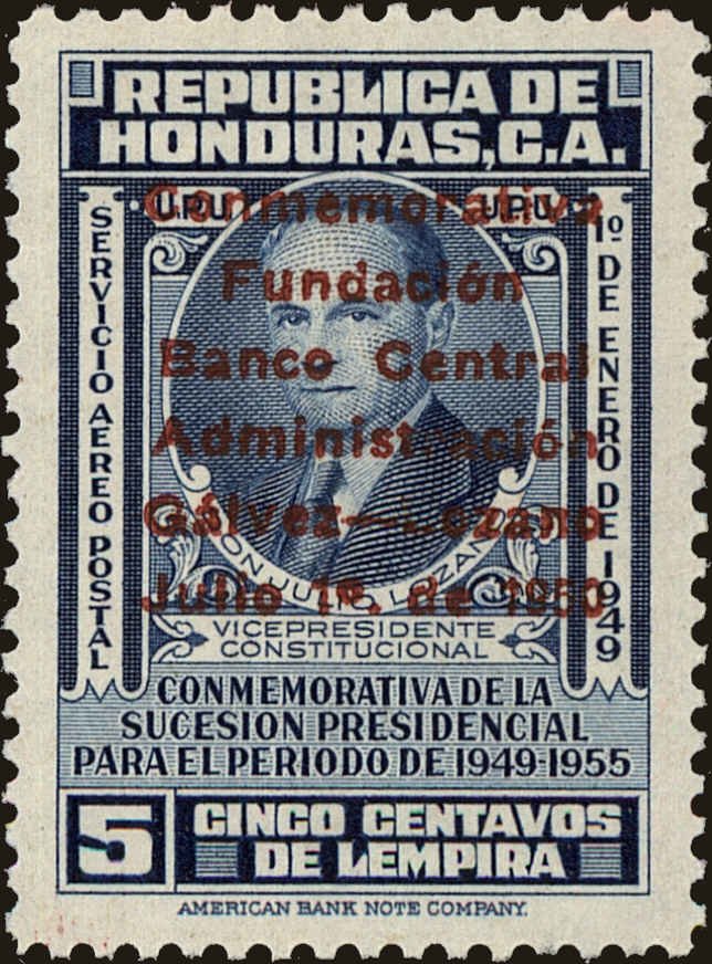 Visibility: public Image owner: none airmail 2/27/1951 5c issue=Central Bank of Honduras founding unwmk Crops No visible images cropped from this one. Measurements Resolution is unknown. Source Source name: Colnect File URL: http://i.colnect.net/b/4967/012/Julio-Lozano-overprinted.jpg Uploaded February 14, 2019, 1:42 am by Stan Shebs |