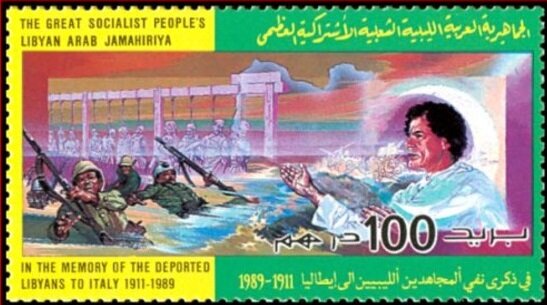 Visibility: public Image owner: none postage 10/26/1989 100dh multi issue=78th Anniversary of Deportation of Libyans to Italy unwmk Crops No visible images cropped from this one. Measurements Resolution is unknown. Source Source name: Colnect File URL: http://i.colnect.net/b/5476/635/Deportation-of-Libyans-to-Italy.jpg Uploaded February 23, 2019, 4:32 pm by Stan Shebs |