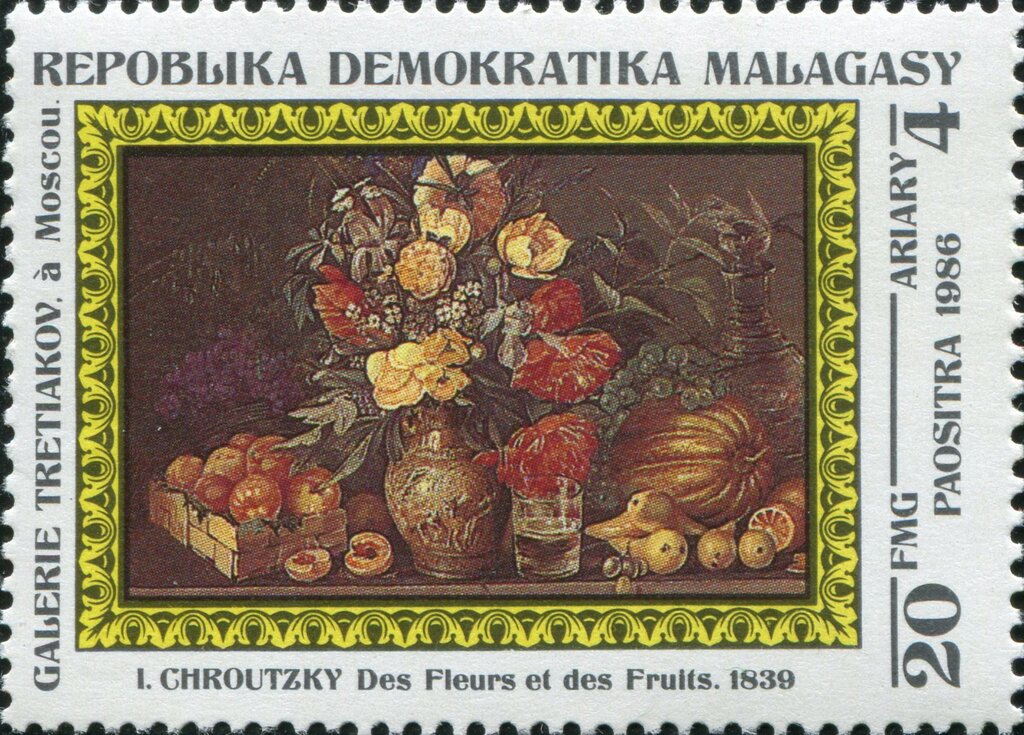Visibility: public Image owner: none postage 4/26/1986 20fr multi dt=paintings in the Tretjakow Gallery unwmk Crops No visible images cropped from this one. Measurements Resolution is unknown. Source Source name: Colnect File URL: http://i.colnect.net/b/5613/044/Still-life-with-Flowers-and-Fruit-1839-by-I-Chroutzky.jpg Uploaded February 25, 2019, 4:52 pm by Stan Shebs |