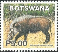 Visibility: public Image owner: none postage 8/5/2002 5.00p multi dt=mammals of Botswana d=bushpig unwmk Crops No visible images cropped from this one. Measurements Resolution is unknown. Source Source name: Colnect File URL: http://i.colnect.net/b/1236/004/Red-River-Hog-Potamochoerus-porcus-.jpg Uploaded August 26, 2014, 9:35 pm by Stan Shebs |