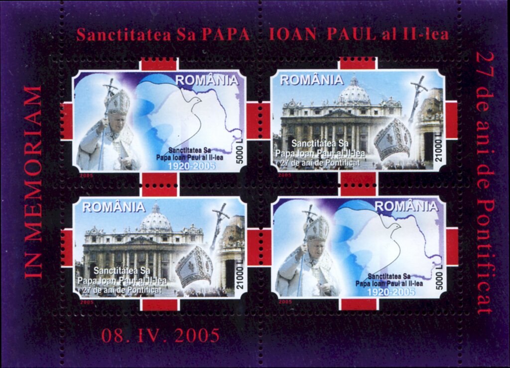 Visibility: public Image owner: none Crops No visible images cropped from this one. Measurements Resolution is unknown. Source Source name: Colnect File URL: http://i.colnect.net/b/5471/698/In-Memoriam-Pope-John-Paul-II.jpg Uploaded March 17, 2019, 7:53 pm by Stan Shebs |