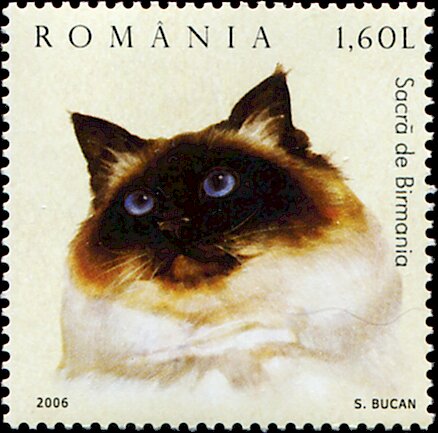 Visibility: public Image owner: none postage 1/20/2006 1.60l multi dt=cats (2006 Romania) d=Sacred Cat of Burma (2006) unwmk perf=13.5 Crops No visible images cropped from this one. Measurements Resolution is unknown. Source Source name: Colnect File URL: http://i.colnect.net/b/5602/489/Burmese-Felis-silvestris-catus.jpg Uploaded March 17, 2019, 7:55 pm by Stan Shebs |