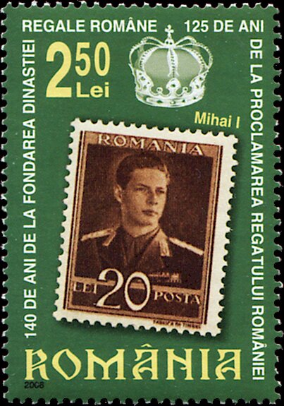 Visibility: public Image owner: none postage 5/8/2006 2.50l multi issue=140 Years since the foundation of the Romanian Royal Dynasty & 125 Years since the Proclamation of t d=stamp of Michael I (issued in 1940) unwmk Crops No visible images cropped from this one. Measurements Resolution is unknown. Source Source name: Colnect File URL: http://i.colnect.net/b/5604/096/Michael-I-issued-in-1940.jpg Uploaded March 17, 2019, 7:56 pm by Stan Shebs |