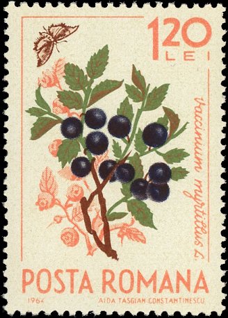Visibility: public Image owner: none postage 12/20/1964 1.20l multi dt=fruits (1964 Romania) d=blueberries (1964) unwmk Crops No visible images cropped from this one. Measurements Resolution is unknown. Source Source name: Colnect File URL: http://i.colnect.net/b/5043/459/Blueberry-Vaccinium-myrtillus--amp--butterfly.jpg Uploaded March 18, 2019, 2:52 am by Stan Shebs |