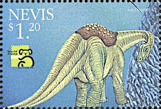 Visibility: public Image owner: none postage 2/22/1999 $1.20 multi issue=Australia '99 dt=prehistoric animals (1999 Nevis) d=Minmi paravertebra wmk=crown & CA perf=14 Crops No visible images cropped from this one. Measurements Resolution is unknown. Source Source name: Colnect File URL: http://i.colnect.net/b/5665/440/Saltasaurus-Saltasaurus-loricatus.jpg Uploaded March 19, 2019, 3:52 pm by Stan Shebs |