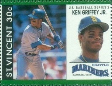 Visibility: public Image owner: none postage 11/30/1989 30c multi dt=Baseball Players of the Major League Baseball d=Ken Griffey Jr. wmk=St Edwards crown & CA perf=12.5 Crops No visible images cropped from this one. Measurements Resolution is unknown. Source Source name: Colnect File URL: http://i.colnect.net/b/5644/019/Ken-Griffey-Jr.jpg Uploaded March 19, 2019, 8:32 pm by Stan Shebs |