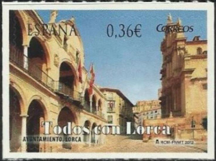 Visibility: public Image owner: none postage 1/2/2012 0.36€ multi issue=Lorca d=The Town Hall unwmk Crops No visible images cropped from this one. Measurements Resolution is unknown. Source Source name: Colnect File URL: http://i.colnect.net/b/5495/760/Solidarity-with-Lorca.jpg Uploaded March 25, 2019, 2:43 am by Stan Shebs |