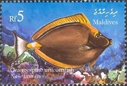 Visibility: public Image owner: none postage 12/24/2002 5.00r multi dt=Reef Fish of Maldives unwmk Crops No visible images cropped from this one. Measurements Resolution is unknown. Source Source name: Colnect File URL: http://i.colnect.net/images/b/961/971/Orangespine-Unicornfish-Naso-lituratus.jpg Uploaded August 26, 2014, 11:04 pm by Stan Shebs |