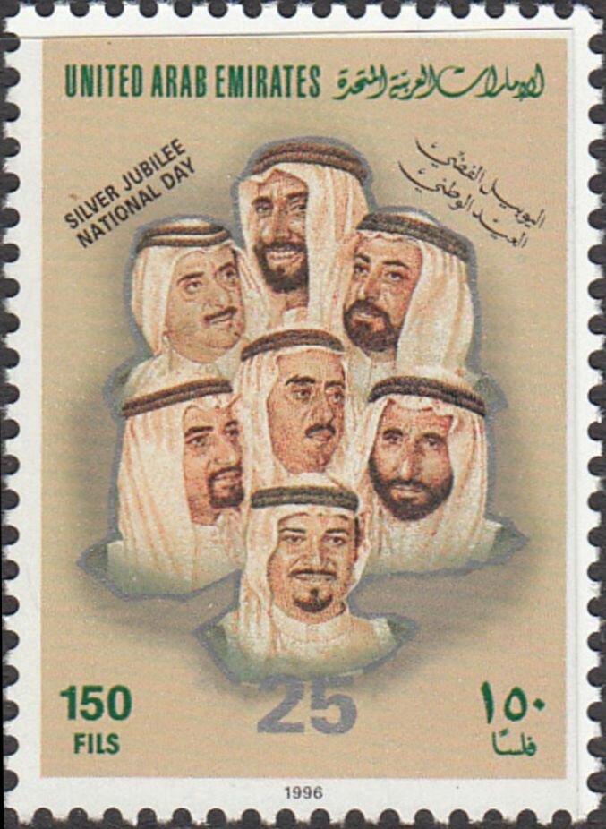 Visibility: public Image owner: none postage 12/2/1996 150f multi issue=25th Anniversary of National Day unwmk perf=12x11.75 Crops No visible images cropped from this one. Measurements Resolution is unknown. Source Source name: Colnect File URL: http://i.colnect.net/b/5684/897/Seven-rulers-of-United-Arab-Emirates.jpg Uploaded April 1, 2019, 7:47 pm by Stan Shebs |