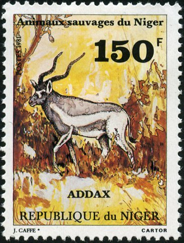 Visibility: public Image owner: none postage 3/17/1981 150fr multi dt=wild animals (1981) d=Addax nasomaculatus (1981) unwmk perf=12.5 Crops No visible images cropped from this one. Measurements Resolution is unknown. Source Source name: Colnect File URL: http://i.colnect.net/b/5112/806/Addax-Addax-nasomaculatus.jpg Uploaded April 9, 2019, 4:02 pm by Stan Shebs |