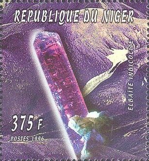 Visibility: public Image owner: none postage 12/10/1996 375fr multi issue=Minerals 1996 dt=minerals (1996 Niger) d=Elbaite indicolite unwmk perf=13.5 Crops No visible images cropped from this one. Measurements Resolution is unknown. Source Source name: Colnect File URL: http://i.colnect.net/b/5204/055/Elbaite-indicolite.jpg Uploaded April 9, 2019, 4:19 pm by Stan Shebs |