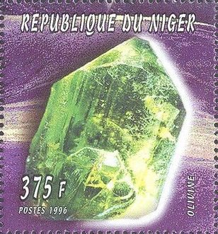 Visibility: public Image owner: none postage 12/10/1996 375fr multi issue=Minerals 1996 dt=minerals (1996 Niger) d=Olivine unwmk perf=13.5 Crops No visible images cropped from this one. Measurements Resolution is unknown. Source Source name: Colnect File URL: http://i.colnect.net/b/5204/057/Olivine.jpg Uploaded April 9, 2019, 4:19 pm by Stan Shebs |