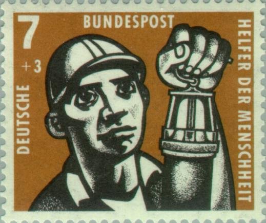 Visibility: public Image owner: none semipostal 10/1/1957 7+3(pf) issue=welfare 1957 dt=miners d=miner holding up lamp wmk=DBP & rosettes Crops No visible images cropped from this one. Measurements Resolution is unknown. Source Source name: Colnect File URL: https://i.colnect.net/b/152/273/Coalmining.jpg Uploaded August 27, 2014, 1:42 pm by Stan Shebs |
