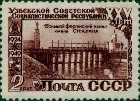 Visibility: public Image owner: none postage 1/3/1950 2r brn issue=Uzbek SSR 25th d=Fergana canal. Koigan-Yarsk dam unwmk perf=12 Crops No visible images cropped from this one. Measurements Resolution is unknown. Source Source name: Colnect File URL: http://i.colnect.net/b/5113/792/Kuigan-Yar-dam-of-The-Great-Fergana-Canal-na-Stalin.jpg Uploaded October 31, 2019, 7:36 pm by Stan Shebs |