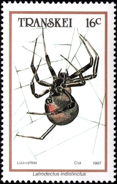 Visibility: public Image owner: none postage 8/27/1987 14c multi issue=Spiders 1987 d=Latrodectus indistinctus unwmk Crops No visible images cropped from this one. Measurements Resolution is unknown. Source Source name: Colnect File URL: http://i.colnect.net/b/5966/049/Black-Widow-Spider-Latrodectus-indistinctus.jpg Uploaded November 6, 2019, 7:50 pm by Stan Shebs |