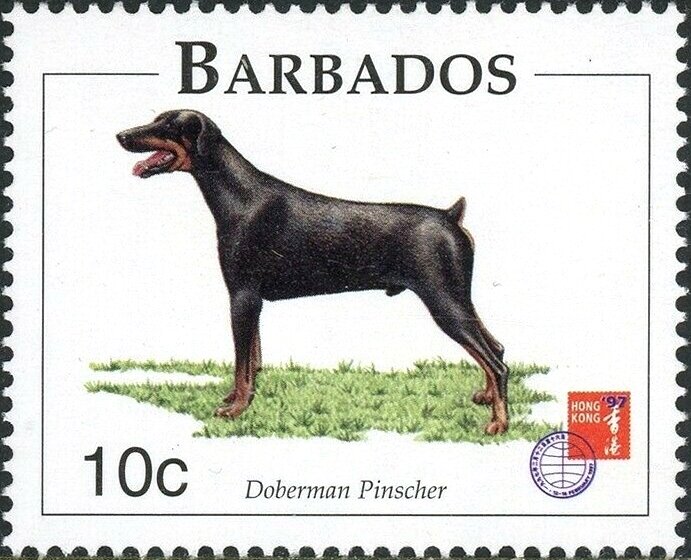 Visibility: public Image owner: none postage 2/12/1997 10c multi issue=HONG KONG '97 dt=dogs (1997 Barbados) d=Doberman pinscher (1997 Barbados) wmk=crown & CA spiral perf=14.25x14.5 Crops No visible images cropped from this one. Measurements Resolution is unknown. Source Source name: Colnect File URL: http://i.colnect.net/b/5604/211/Doberman-Pinscher-Canis-lupus-familiaris.jpg Uploaded November 8, 2019, 12:14 am by Stan Shebs |