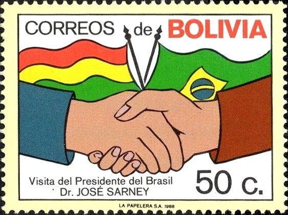 Visibility: public Image owner: none postage 8/2/1988 50c multi issue=Visit of President Jose Sarney of Brazil unwmk Crops No visible images cropped from this one. Measurements Resolution is unknown. Source Source name: Colnect File URL: http://i.colnect.net/b/5872/612/Handshake-National-Flag-of-Bolivia-and-Brazil.jpg Uploaded November 9, 2019, 4:23 pm by Stan Shebs |