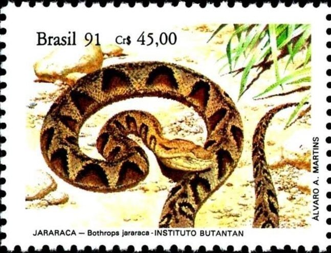 Visibility: public Image owner: none postage 6/6/1991 45.00cr multi issue=90th Anniversary of the Butantan Institute and the 173rd Anniversary of the National Museum d=Bothrops jararaca unwmk perf=11.5x12 Crops No visible images cropped from this one. Measurements Resolution is unknown. Source Source name: Colnect File URL: http://i.colnect.net/b/4895/326/Jararaca-Bothrops-jararaca.jpg Uploaded November 9, 2019, 7:55 pm by Stan Shebs |