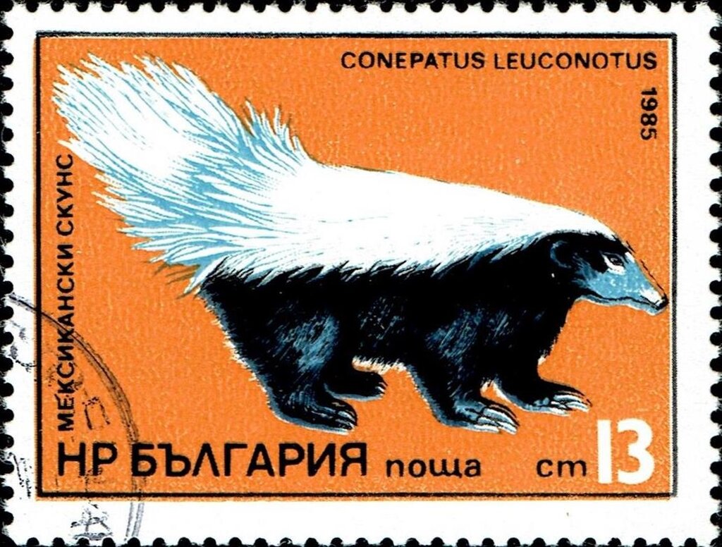 Visibility: public Image owner: none postage 1/17/1985 13st multi dt=carnivorous mammals d=Conepatus leuconotus unwmk perf=13x12.75 Crops No visible images cropped from this one. Measurements Resolution is unknown. Source Source name: Colnect File URL: http://i.colnect.net/b/5573/414/American-Hog-nosed-Skunk-Conepatus-leuconotus.jpg Uploaded November 11, 2019, 8:14 pm by Stan Shebs |