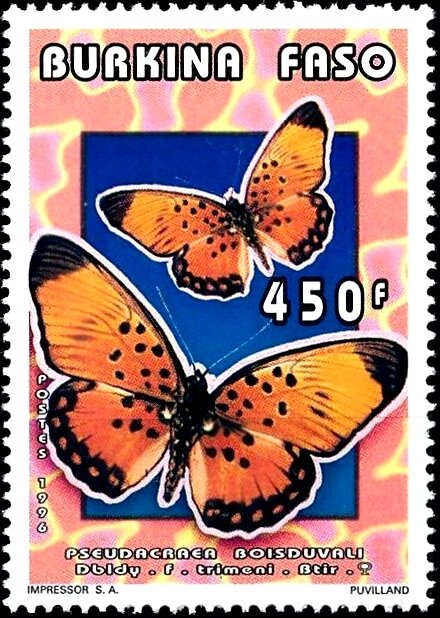 Visibility: public Image owner: none postage 6/28/1996 450fr multi issue=Butterflies 1996 dt=butterflies (1996 Burkina Faso) d=Pseudacraea boisduvali (1996) unwmk Crops No visible images cropped from this one. Measurements Resolution is unknown. Source Source name: Colnect File URL: http://i.colnect.net/b/5924/604/Boisduval--s-False-Acraea-Pseudacraea-boisduvali.jpg Uploaded November 11, 2019, 10:24 pm by Stan Shebs |